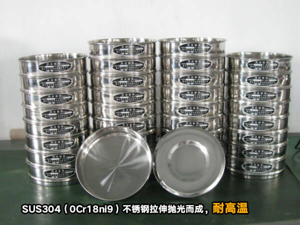 篩框采用SUS304(0Cr18ni9)不銹鋼拉伸拋光而成,壁厚0.6毫米,表面光可鑒人,整體成型堅固耐用,沒有磁性,篩網與篩框通過錫焊固定,不會松弛。能耐300度以下高溫。