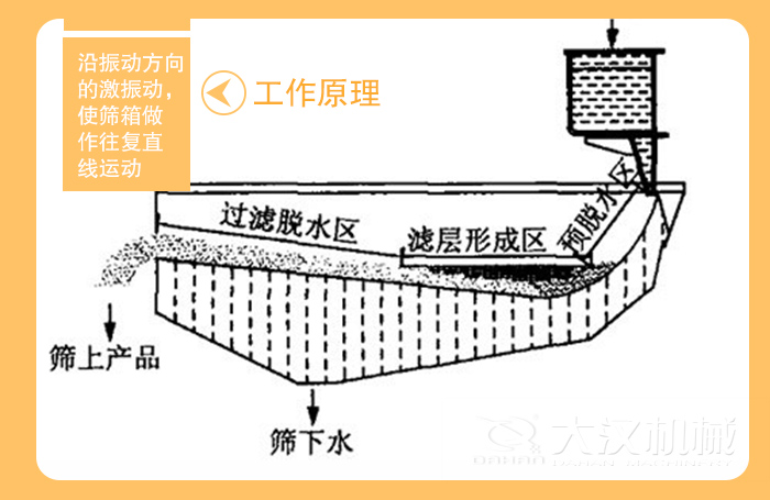 脫水篩采用了雙電極自同步技術,通用型偏心塊、可調振幅振動器。主要由篩箱、激振器、支承系統及電機組成。通過膠帶聯軸分別驅動兩個互不聯系的振動器作同步反向運轉,兩組偏心質量產生的離心力沿振動方向的分力疊加,反向離心抵消,從而形成單一的沿振動方向的激振動,使篩箱做作往復直線運動。