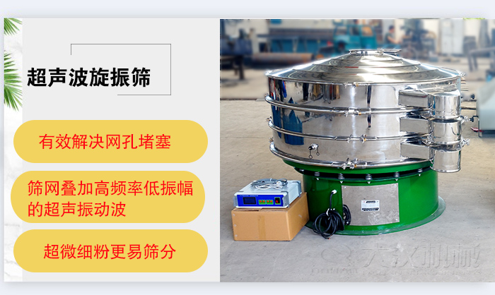 超聲波旋動篩用振動電機上、下兩端安裝有偏心重錘,它將電機的旋轉運動轉變?yōu)樗健⒋怪薄A斜的三次元運動,再把這個運動傳遞給篩面。