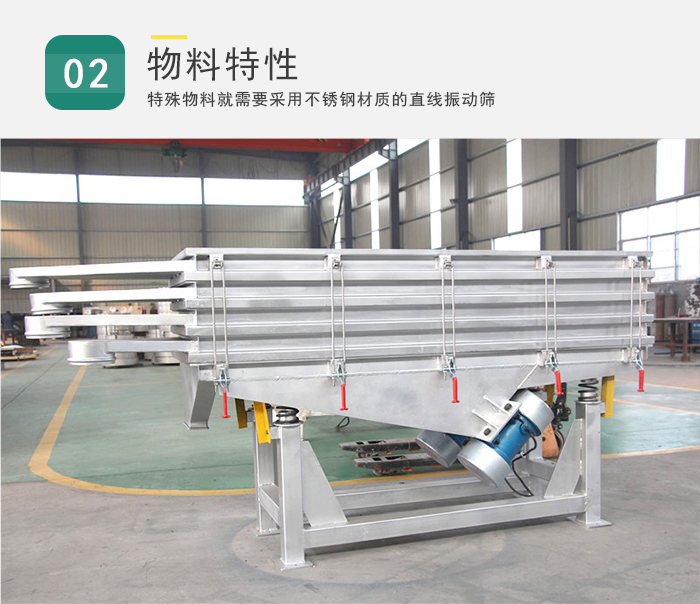 有些物料帶有腐蝕性,例如:硝酸、硫酸等,就需要采用不銹鋼材質的直線振動篩,還有一些有嚴格的衛生標準例如醫藥行業和食品行業,例如大豆,糧食,中藥粉等,需要用不銹鋼直線振動篩