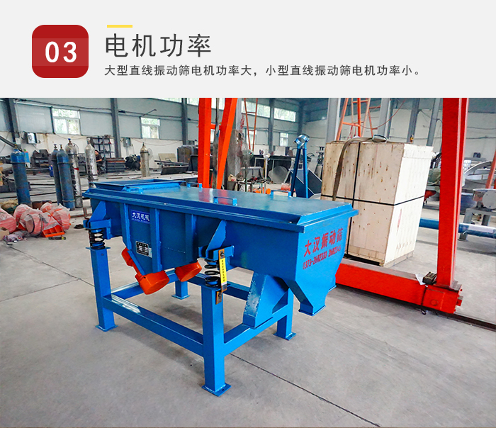 大型直線振動篩電機功率大,小型直線振動篩電機功率小,看您的篩分要求產量大就選大型直線振動篩,因為功率大,您的篩分要求產量低的話就選用小型直線振動篩,電機功率小的