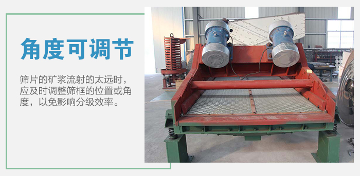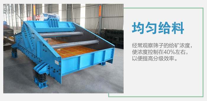 1、設(shè)備正常運(yùn)轉(zhuǎn)時(shí),應(yīng)經(jīng)常觀察篩子的給礦濃度,使?jié)舛瓤刂圃?0%左右,以便提高分級(jí)效率。 2、因該篩分級(jí)效率高,脫水性能好,篩上量濃度高,使得篩上量溜槽中的礦漿流動(dòng)性差,應(yīng)配上水管。