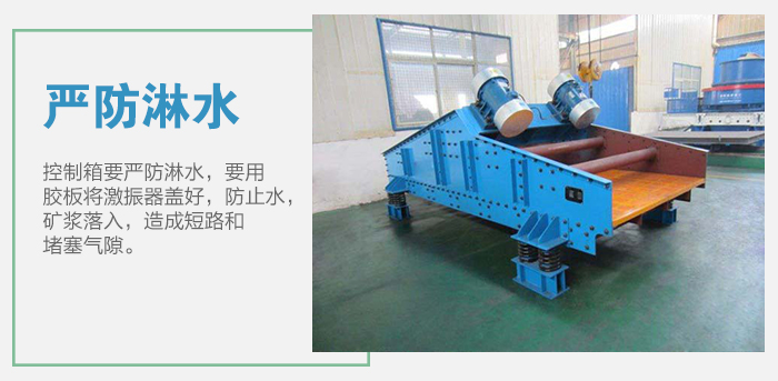 3、電磁激振器與控制箱要嚴(yán)防淋水,以免短路。要用膠板將激振器蓋好,防止水,礦漿落入,造成短路和堵塞氣隙。 4、隨時(shí)檢查各部位螺栓是否松動(dòng),以及篩框是否與溜槽等碰撞。