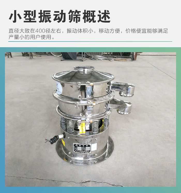 小型振動篩為400mm直徑一層兩個出口不銹鋼振動篩,整機采用304不銹鋼材質,廣泛應用于食品,醫藥,顆粒型物料的篩分行業。